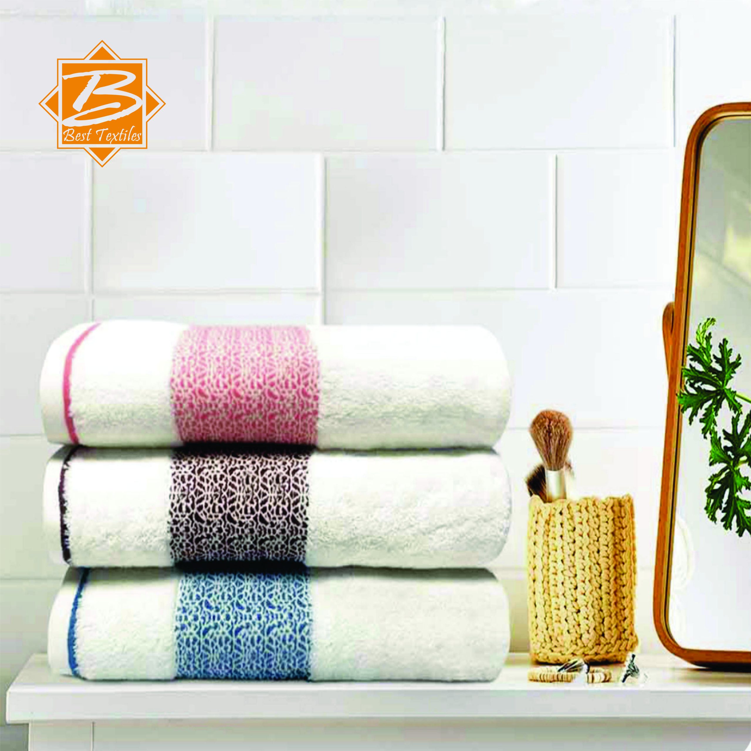 Our bath towel is characterized by a knitted dobby diamond cut border design. It is a thick and exquisite towel with excellent absorbency, and it’s a great addition to bathrooms and stands out from other stylish towels.